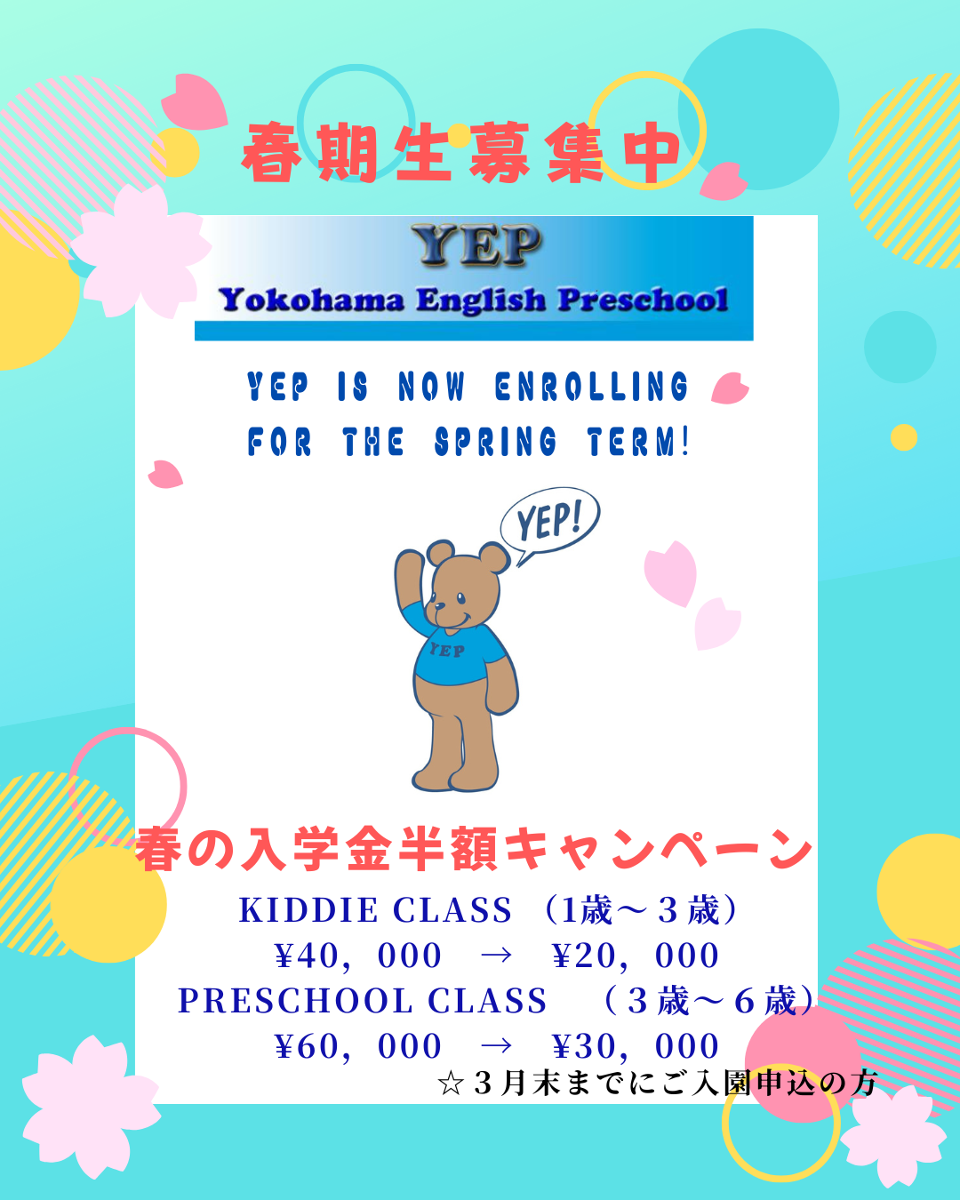 YEPでは、ただいま春から新入園のお子様を募集しています。